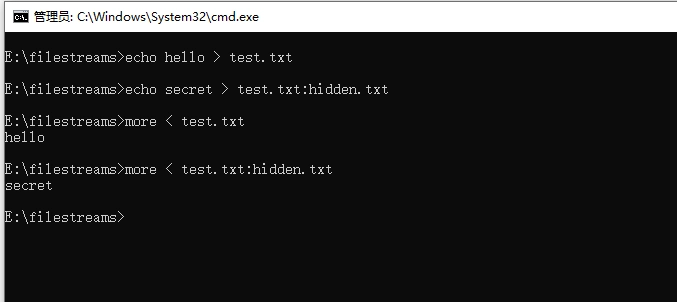 在代码中进行读写备用数据流的时候,和普通文件没有区别,唯一的区别 OpenFile 的时候,指定的是备用数据流文件名,如 test.txt:hidden.txt