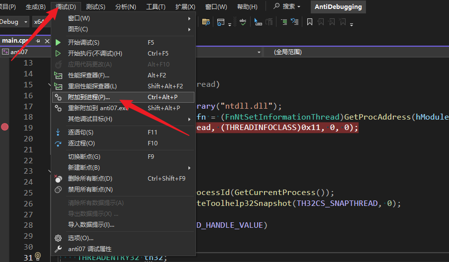 在 anti07.exe 在被 hook 之后,使用 vs2022 附加调试该进程,然后在代码中下断点,这时候就可以正常调试进程了
