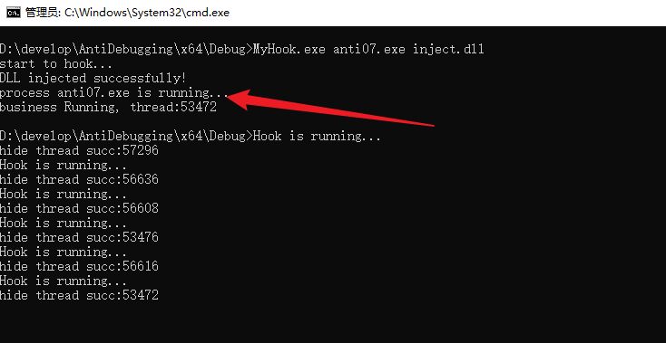 开始的时候 anti07.exe 正常运行,接着运行 MyHook.exe 37080 inject.dll 将动态库进行注入,输出 Hook is running... 信息