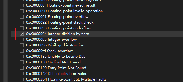 在 vs2022 中,如果勾选了除零异常(在 “调试” -> “窗口” -> “异常设置” 中),调试的时候就会中断在异常位置,F5 会继续执行,调试器并不会处理该异常