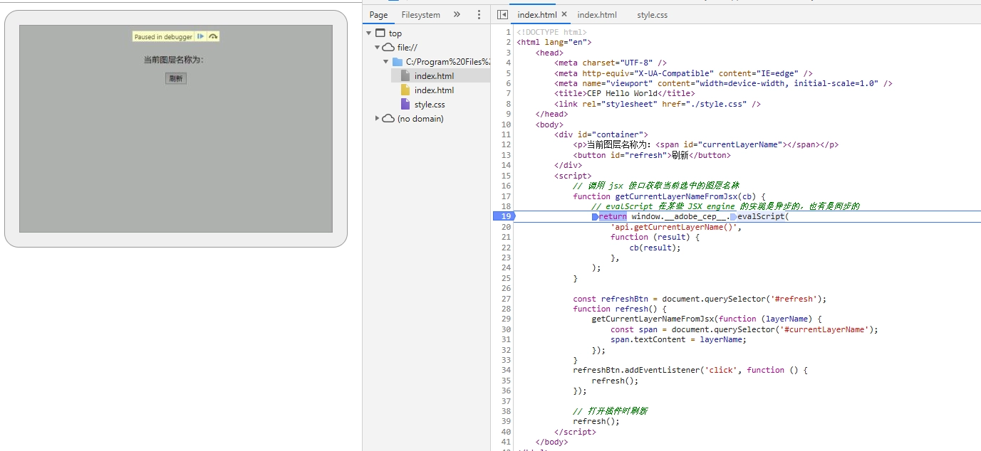 点击 CEP Hello World 可以显示插件的窗口如下,这里的前端代码可以在 chrome 的开发者工具中进行调试,和传统的 web 开发没什么区别