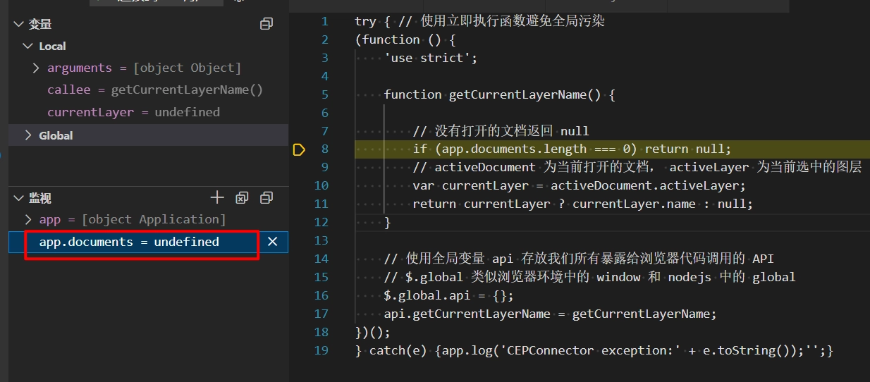 前端代码通过 evalScript 调用 JSX 的 api.getCurrentLayerName 代码,调试结果显示没有一个 app.documents 对象,这个是属于 PS 的对象