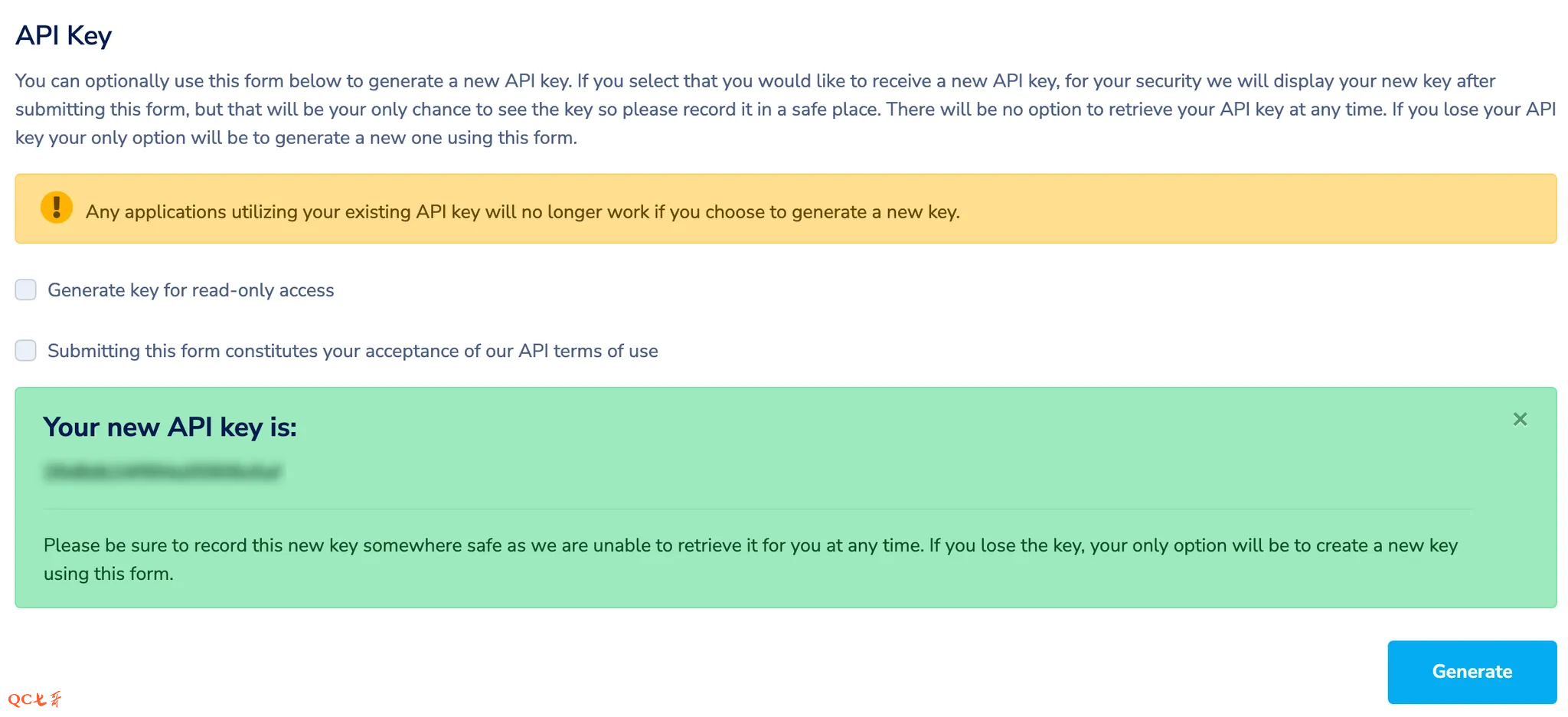 生成 key 的显示如下,提示:Your new API key is: