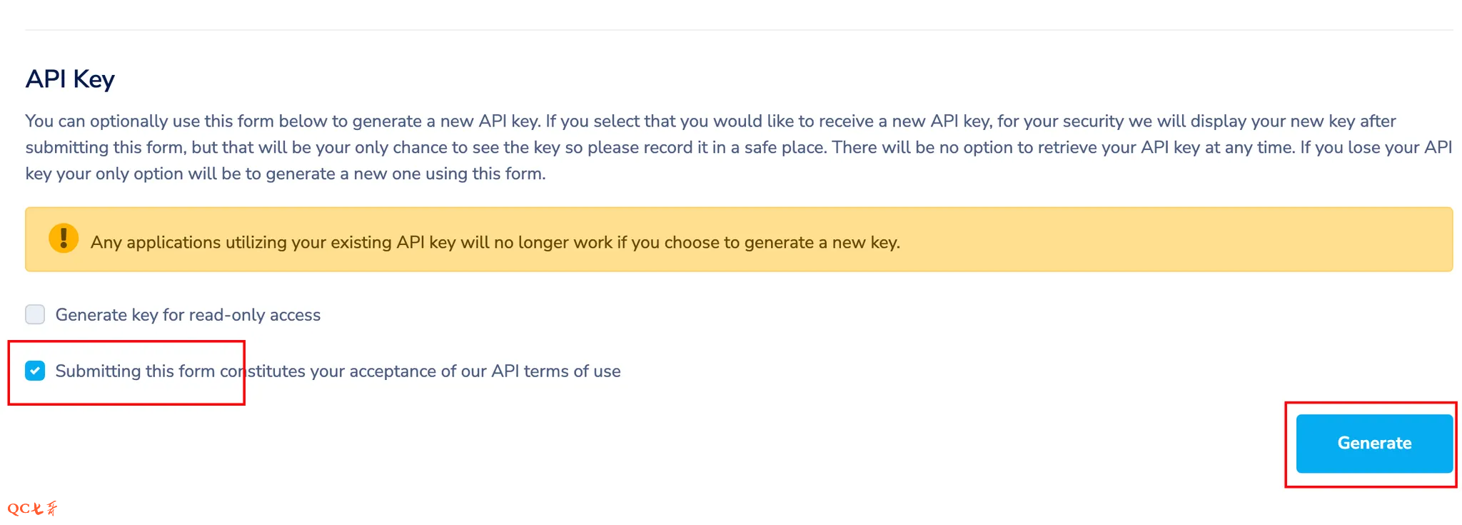 勾选第二个框,然后点击提交,会生成一个 API key,如:7ta0fg6pbw8dtops02irop,申请证书需要用到这个key