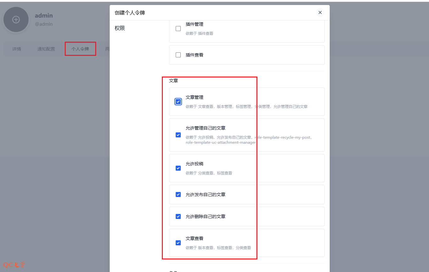 在后台的个人配置中增加个人令牌,并进行文章管理授权