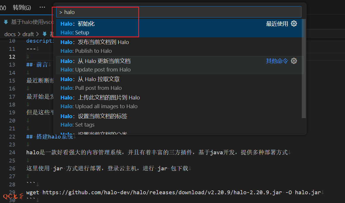 在 vscode 的插件中心,直接搜索 halo ,进行插件安装