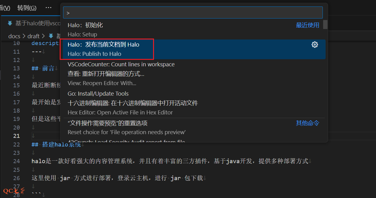 然后调出命令操作,选择 Publish to Halo,没问题的话文章就可以发布到 halo 系统中了