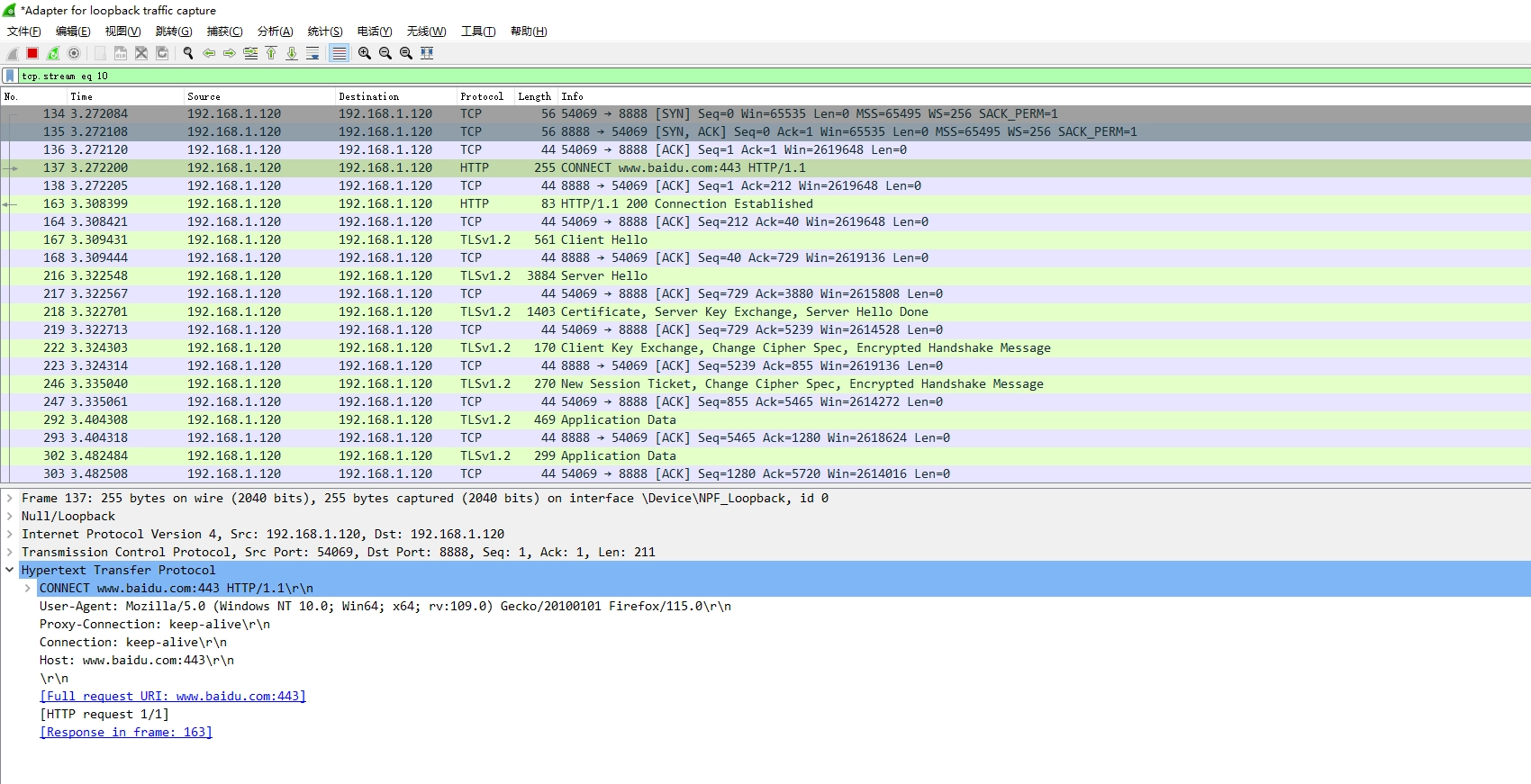 firefox 浏览器设置 https 代理,访问百度站点首页,通过报文可以发现,对比正常的 https 请求来说,多了 CONNECT 请求和响应