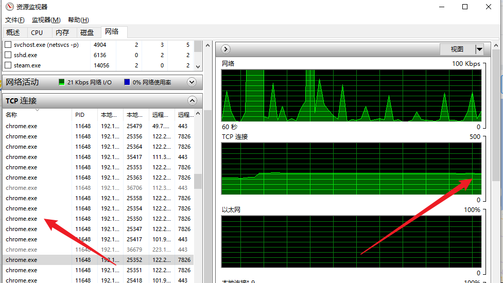 一台手机/电脑连接数通常在数百到数千不等,如下是 win10 下资源监视器中显示的连接数,显示的连接数大概在两百左右