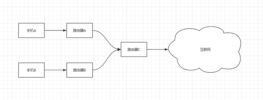由于路由器的默认的隔离状态,以及广播域被分割,除非特别配置,这种广播和查找在下面这种路由架构中就会失败,这里 路由C 对应家庭宽带出口
