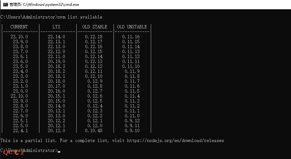 nvm list available 查看有哪些可用的 node 版本,需要安装的时候优先选择 LTS 版本
