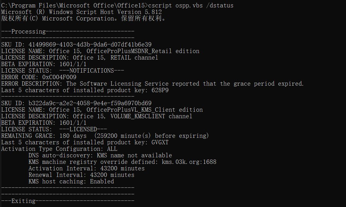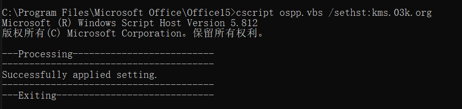 密钥安装成功后,分别执行下面的命令,分别是:设置 KMS 服务器,激活 office2013,查看 office2013 激活状态