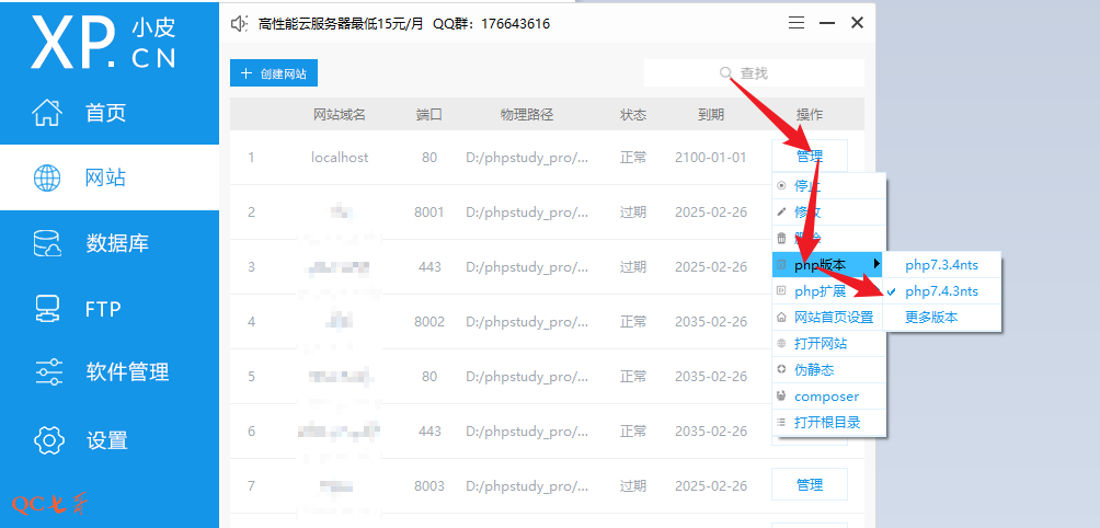 小皮中选中要调试的 php 版本,这里配置 7.4.3 版本的