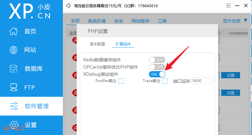 在弹出的设置窗口中,开启 xdebug 调试组件,端口如果需要的话可以修改