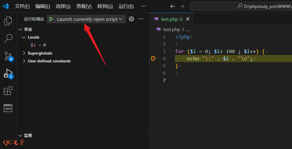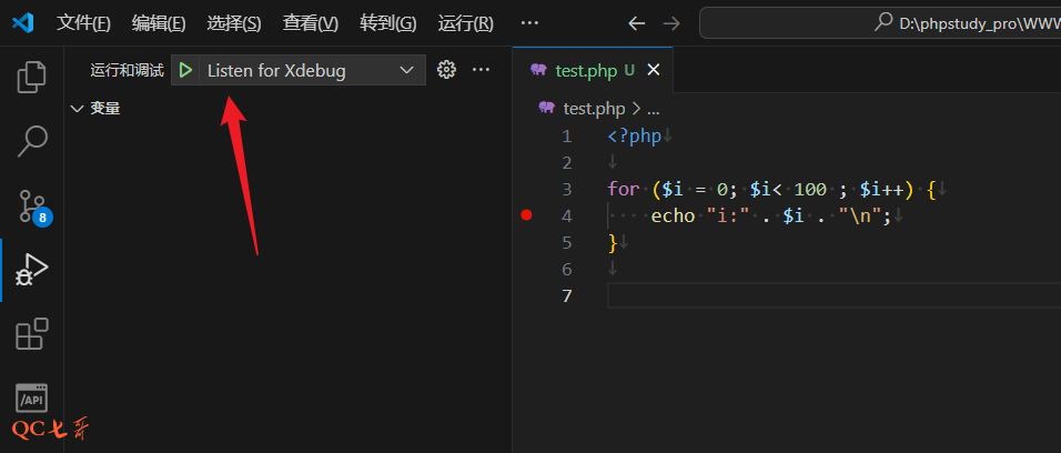 回到 vscode 中,点击 Listen for Xdebug 启动,然后浏览器中访问 http://localhost/test.php