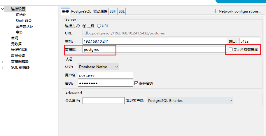 这里还有一个坑,在 dbeaver 中新建 postgres 数据库连接的时候,默认是不会勾选 显示所有数据库 的,导致连接上后只会显示这里填入的数据库