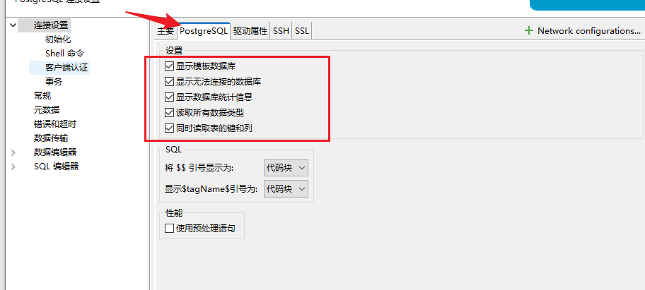 另外在 postgres 标签页,可以把这里的全部勾选上,然后在 dbeaver 中连接上后,就和普通的 mysql 使用没有什么区别了