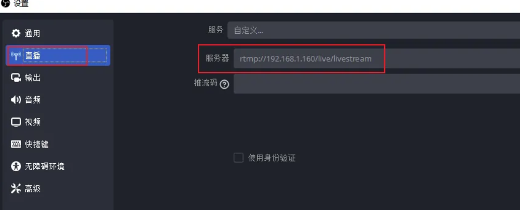 也可以使用 OBS 进行推流,配置直播中的服务器地址为 rtmp://192.168.1.160/live/livestream