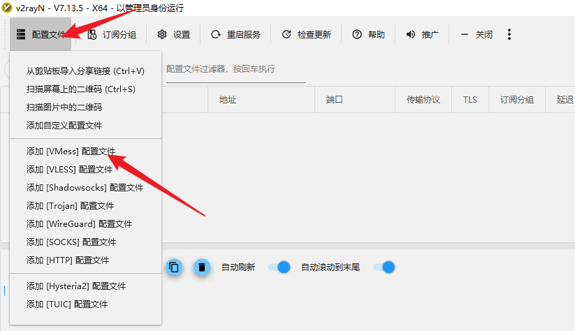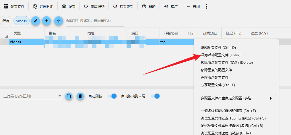回到 vmess 界面,选定添加的记录,然后右键 设为活动配置文件