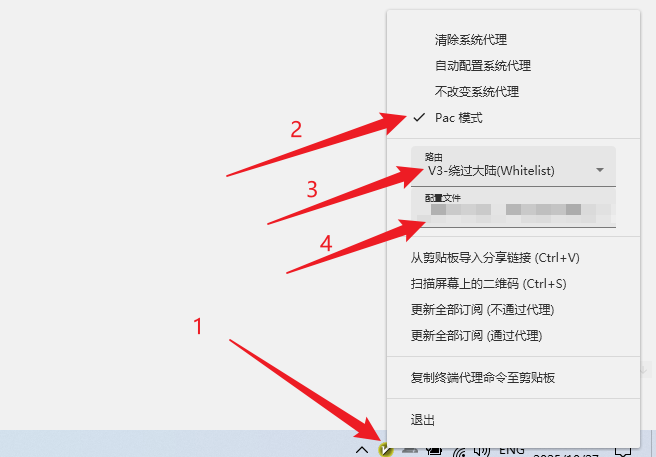 在任务栏中,选择 v2ray 的图标,右键在弹出的菜单中指定 pac 模式,路由选择 绕过大陆,配置选择刚添加的节点