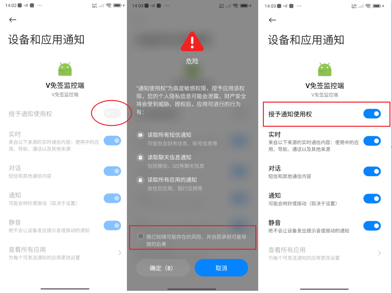 点击开启后,弹出一个危险的窗口,因为应用需要获取展示在通知栏中的消息,通知栏中里面可能会有用户的隐私数据,因此会被系统标记为高危动作