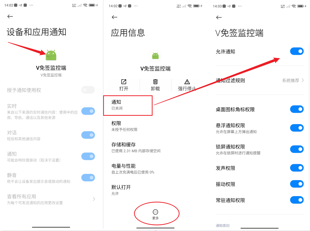 点击界面中图标位置,在界面中将通知权限设置为允许,以及底下的 更多 中设置 允许受限制的设置