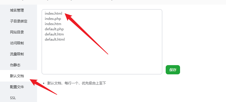 新建站点的时候,默认的文档为 index.php 优先,需要将默认文档修改改为 index.html 优先
