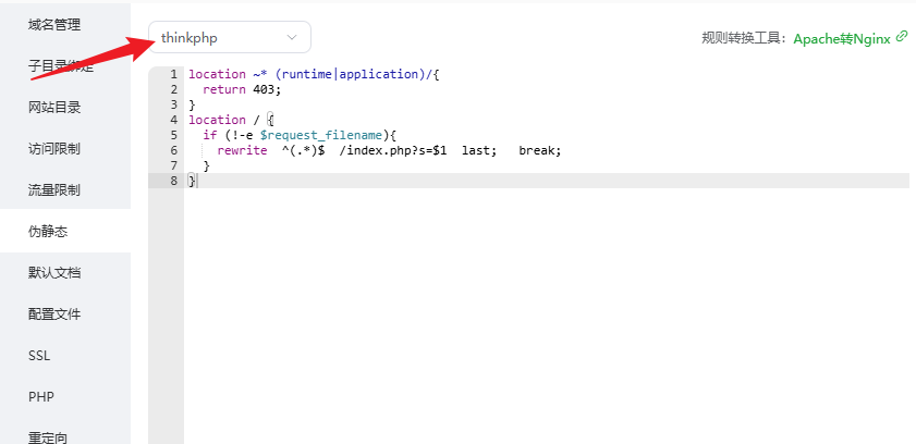 在伪静态的下拉框列表中选择 thinkphp 的版本,或者手工输入以下配置进行保存