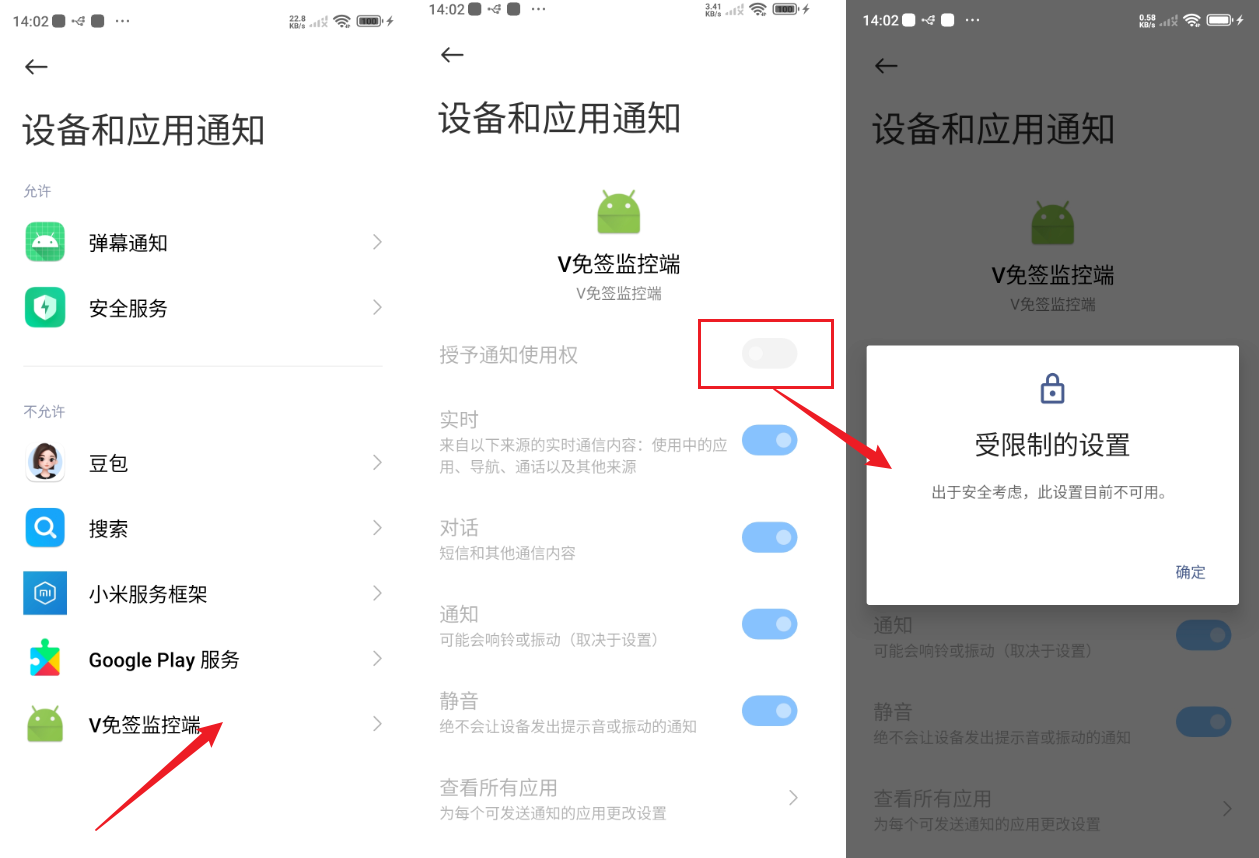 安装完毕后,在弹出的 设备和应用通知 窗口中选择 v 免签,接下来的窗口中 授予通知使用权 是灰色的,点击会弹出受限制的设置窗口