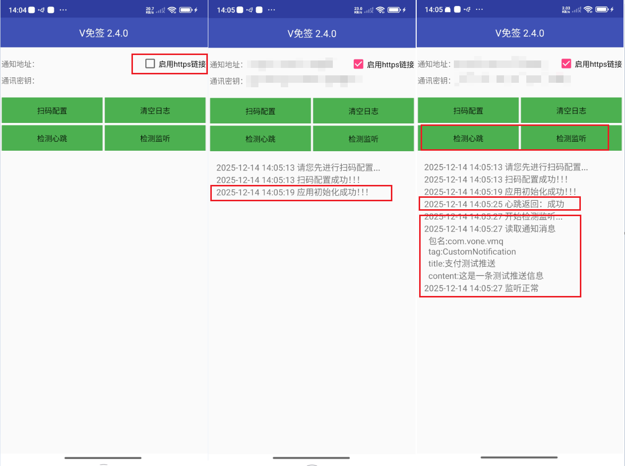 扫码配置后,界面显示 应用初始化成功 则表示已经配置成功了,可以点击 检测心跳 和 检测监听 来确认应用是否正常