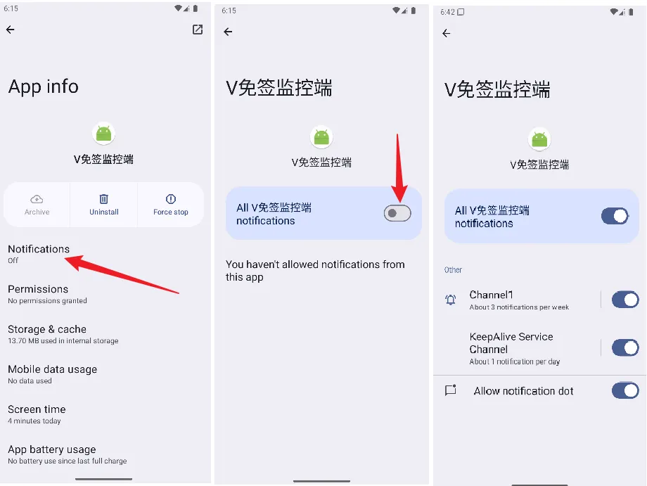如果 设备和应用通知 这里被关闭了,也可以在 应用设置 => 应用管理 => 选择V免签客户端 => 通知管理 => 允许通知 中进行设置