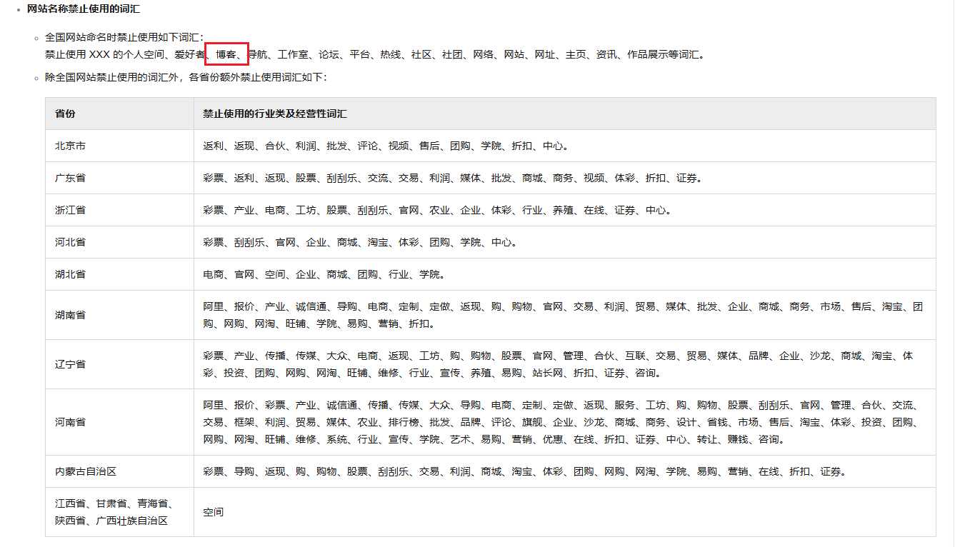 比如 “博客” 就不允许填写,完整的限定词列表参考如下,怎么填写更容易通过审核我也不清楚,但是检查一下这里的限定词应该基本可以避开