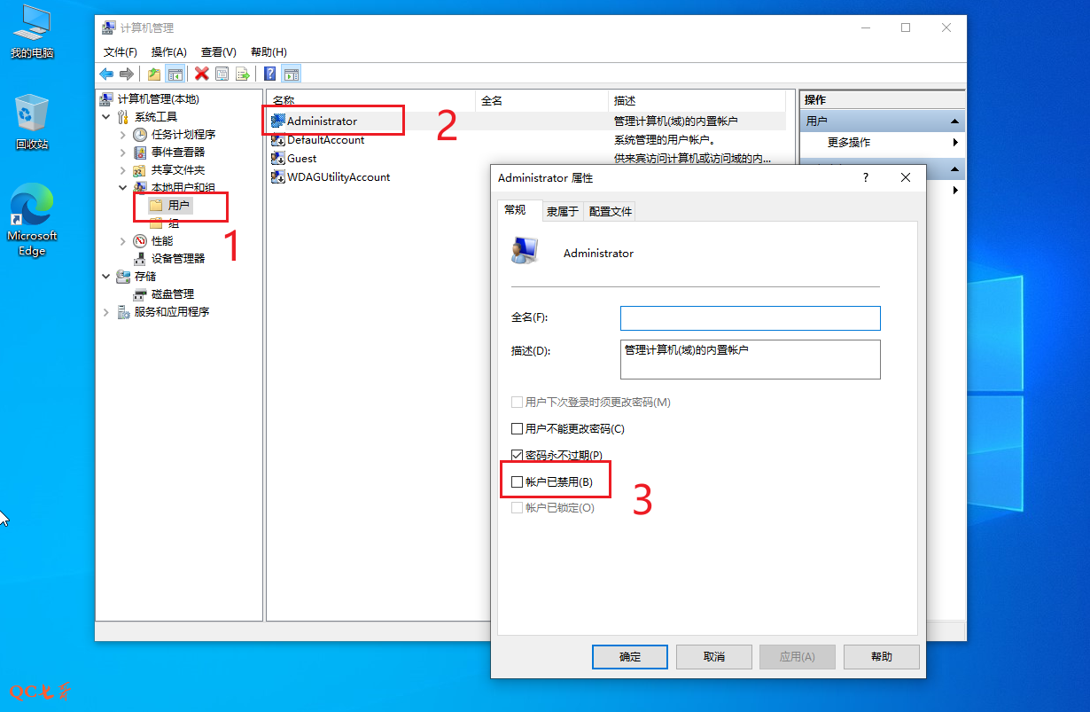 点击 “administrator” 右键属性,在打开的属性窗口中,将 “账户已禁用” 取消勾选